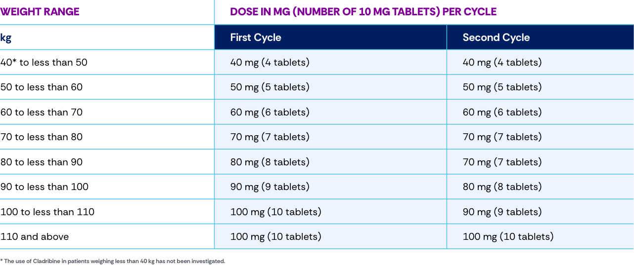 Dose of Cladribine tablets per cycle by patient weight in each treatment course
